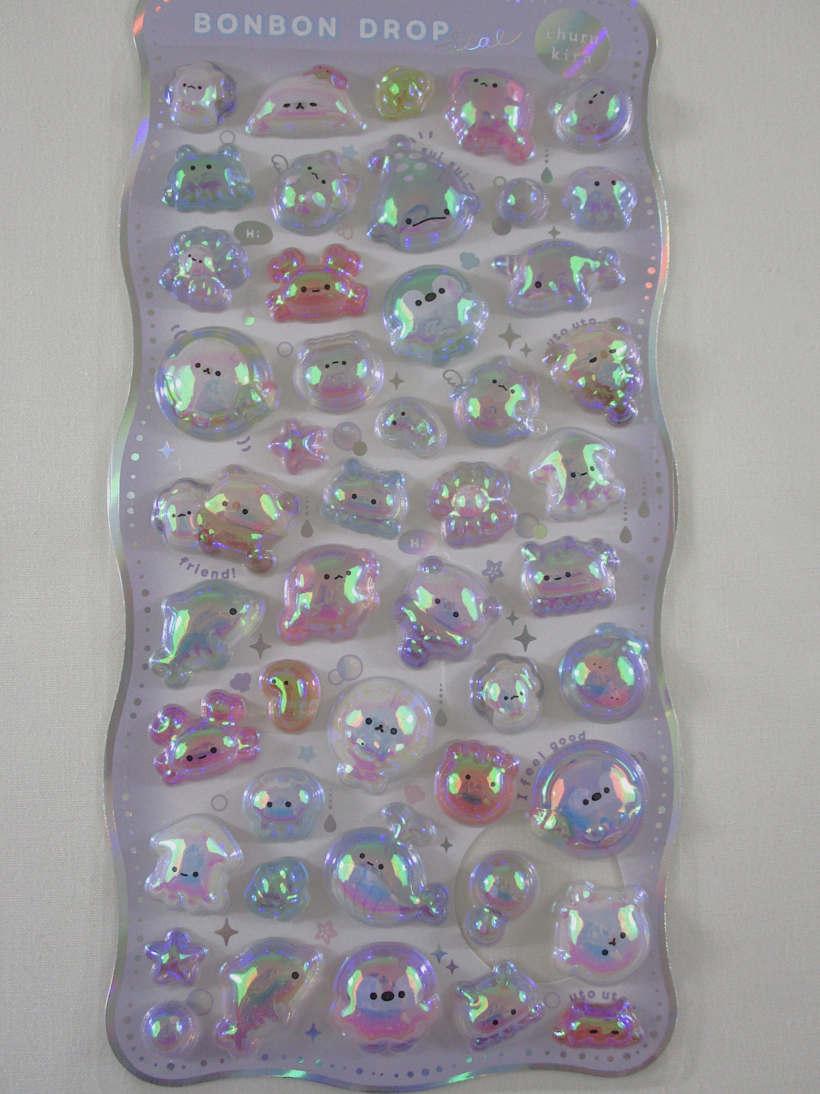 Size of the sheet is about 3.5 x 8 inch. The stickers are made of thick pvc type material that create 3D surface, like candy drop.