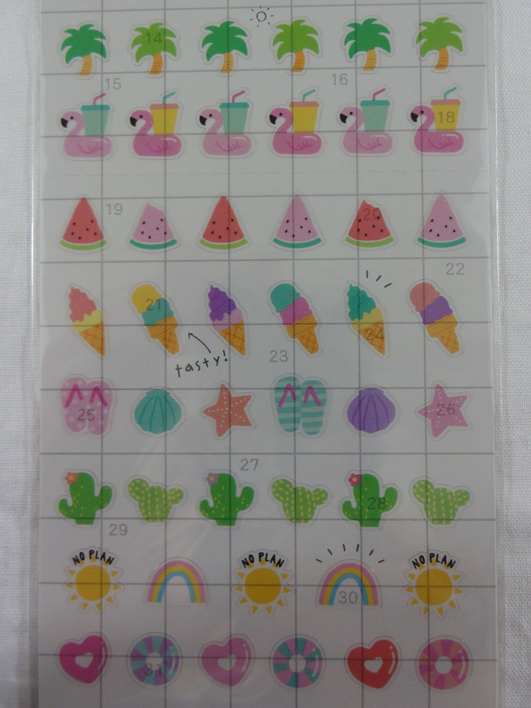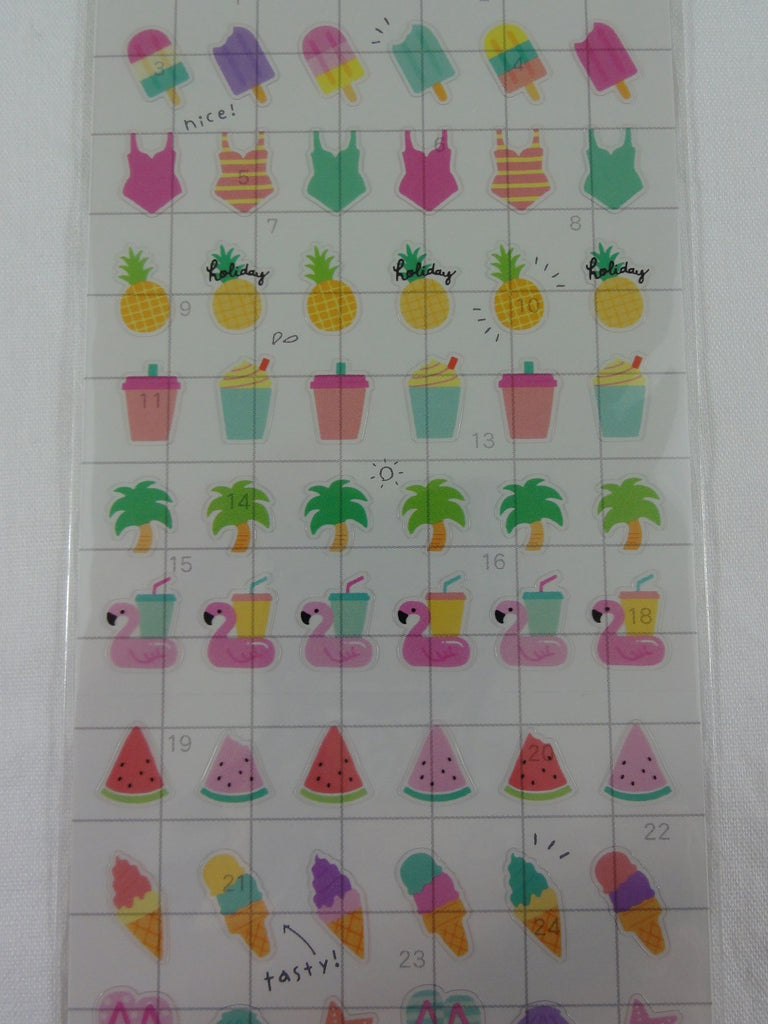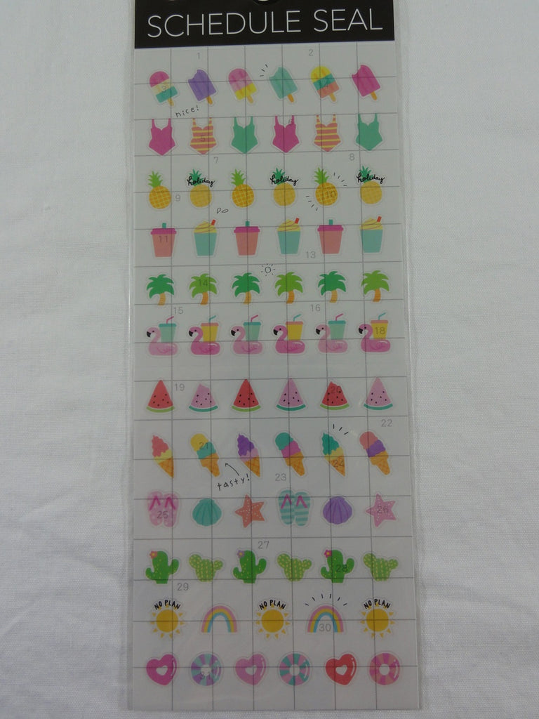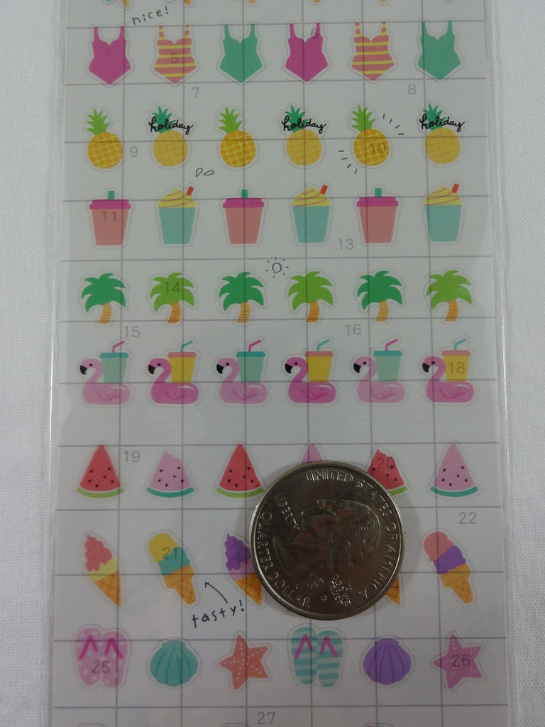 Includes: ice cream, swimsuit, drinks, watermelon, shellfish, cactus, sun, heart, palm tree, sandals, and many others.